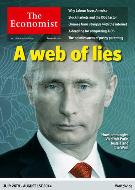 За 2014 год на обложке британского издания The Economist Путин появился пять раз. К сравнению, Барак Обама на обложке The Economist в этом году побывал только однажды – в номере от 27 сентября. На фото представлен номер от 6 сентября 2014 года. В 2006 году один из номеров вышел с примечанием «Не шутите с Россией». На обложке не самый аккуратный фотоколлаж представляет Владимира Путина в классическом образе чикагских гангстеров. Вместо настоящего пистолета в руках у героя обложки — пистолет заправочный: на рубеже 2006-2007 годов Запад всерьез опасался тем, что российские власти «играют энергетическими мускулами», то есть время от времени угрожают прекратить поставку ресурсов.