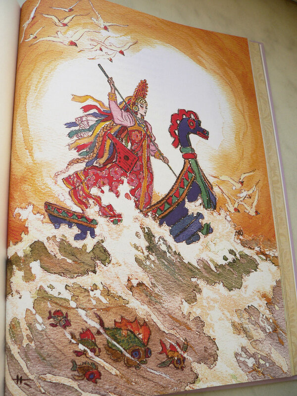 И еще возникающая проблема. Мне всегда нравился подход, когда не серийность (или пр. маркетинговые запросы) диктует особенности издания, а исходный материал. Здесь применен иной вариант. Формат для данной книги выбран очень большой, навскидку равный нигмовскому изданию Конька-горбунка. Издательство, видимо учтя чужой опыт, загнало иллюстрации "под обрез". А, учитывая выбранный формат, это заставило увеличить иллюстрации примерно на 150 процентов от оригиналов, но поскольку рисунок делался под открытки (т. е. он и так упрощенный), то это привело к спорному, на мой взгляд, результату.