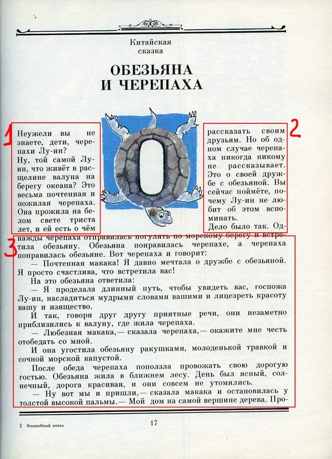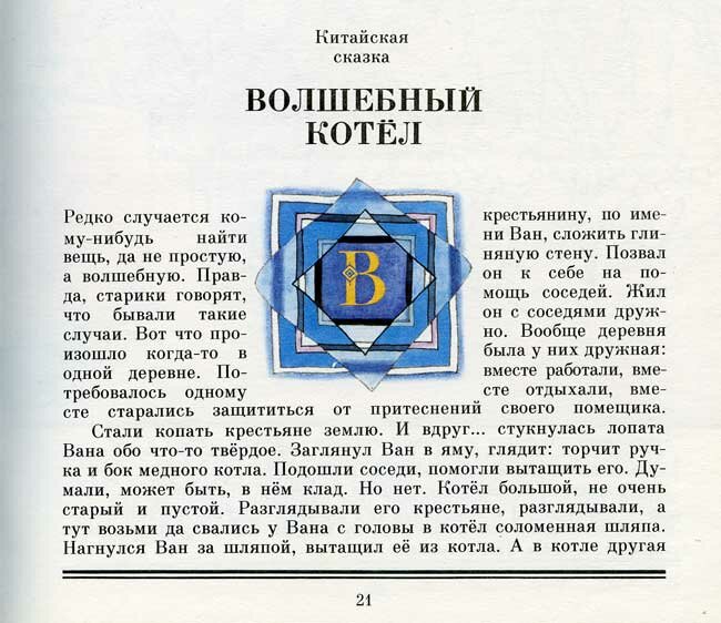 Но самое странное - это буквицы. Буквицы рисовались мастерски, к каждой сказке, причем стилистически они были связаны с полностраничной иллюстрацией и обыгрывали название сказки, при этом они стояли внутри текста, но это была не первая буква начала текста, а первая буква названия сказки, то есть разбивали текст на отдельные несвязанные блоки. При этом редактор не посчитал нужным хоть как-то решить проблему начала предложения и переносов. Вот что получилось.