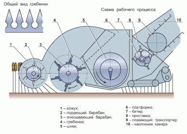 Принцип действия жатки состоит в обмолоте растений на корню путем их очеса гребенками, расположенными на очесывающем барабане жатки. При этом стебель растения захватывается гребенками и протягивается сквозь щель между их зубьями, освобождаясь от зерна (семян). Образующаяся таким образом хлебная масса, на 80% состоящая из свободного зерна, под действием сил инерции и воздушного потока перемещается к шнековому транспортеру и наклонной камерой подается в молотилку комбайна для окончательного домолота и сепарации.