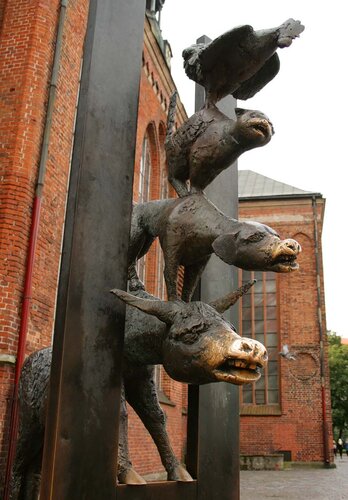30-31. Памятник Бременским музыкантам (дар Риге от города-побратима) и живой музыкант неподалеку: