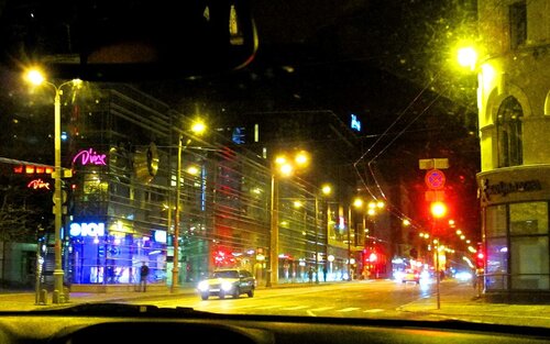 67.* Но время поджимает и едем обратно через город. В зеркале слева отразился знаменитый логотип "Сакты", самого известного сувенирного магазина в советское время: