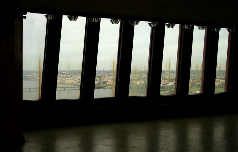 42.** Однако наверху поджидает неприятный сюрприз - смотровые окна тут грязные :-( Вот фотографии, снятые в октябре 2006 года - http://renatar.livejournal.com/44987.html - тогда все было намного пристойнее. Тем не менее, наш домашний фотокорреспондент ухитрился найти несколько точек почти на уровне пола, где виды были получше, а мне еще пришлось помучиться с обработкой фотографий, которые вы увидите ниже.