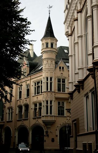18. Альберта, 12. "Здание характеризует элегантный приём структурной организации здания — имитированный фахтверк над верхними этажами, применённый здесь в качестве чисто декоративного элемента. Угловой ризалит богато декорирован растительным орнаментом (сосновые ветви) с изображениями белок и клестов, как бы инкрустированными в сосновый декор. "