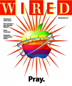 34. Wired (июнь, 1997)На обложке - изображение разноцветного яблока от компании Apple в колючей проволоке и c надписью: "Молитесь".В статье номера "101 способ спасти Apple" приводились оценки, что возможно сделать, чтобы спасти компанию от краха.Компания Apple была основана в 1976 году, однако к 1997 году в результате серьезной конкуренции со стороны других компаний, Apple столкнулась со значительными экономическими трудностями.С тех пор компании Apple удалось вернуть утерянные позиции, частично благодаря огромному успеху iPod.![]()