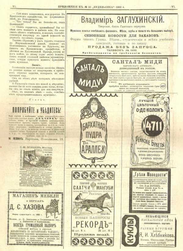 Пародийные «новости» из разных губерний сменяются пародийной же рекламой и частными объявлениями: «В каретном ряду делаются сообразно нынешним большим шляпам и находящимся на оных перьям, кареты двух сажен в длину и трех в высоту. В оном же ряду делаются такие аглинские высокие коляски, на которых, подъехавши, можно говорить с человеком, живущим во втором этаже; также удобно с оных входить прямо на балконы».