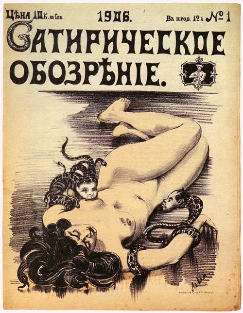 9 января 1905 Николай II отдал приказ о расстреле мирной демонстрации. Кровавое воскресенье изменило политическую ситуацию в Российской Империи, явилось знаковым событием и огромным толчком в формировании общественного мнения. В связи с крахом цензуры, было издано более трехсот различных сатирических журналов (это более чем в течение полного девятнадцатого столетия). Художники стремились запечатлеть революционные события в довольно резкой сатирической форме. Они изображали отталкивающие кровавые сцены в символистской манере.Большинство журналов были недолговечны и исчезли непосредственно вслед за своим появлением на свет, не доживая до второго номера. Некоторые закрылись от равнодушия читающей публики, задавленной изобилием выходящих сатирических журналов. Гораздо большее число было прекращено постановлениями учреждений по делам печати и определениями судебной палаты.1. «Мефистофель» № 1 1906.