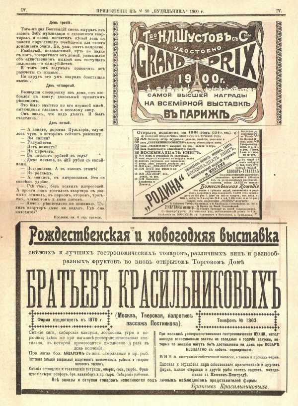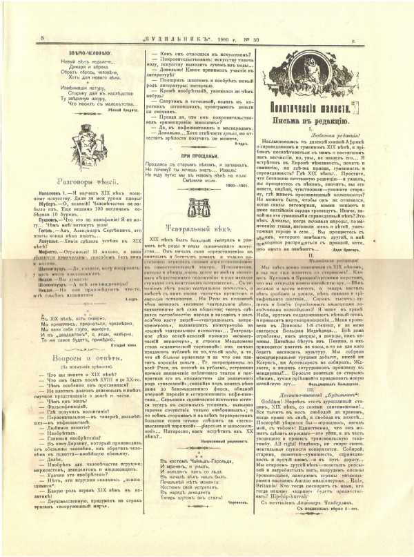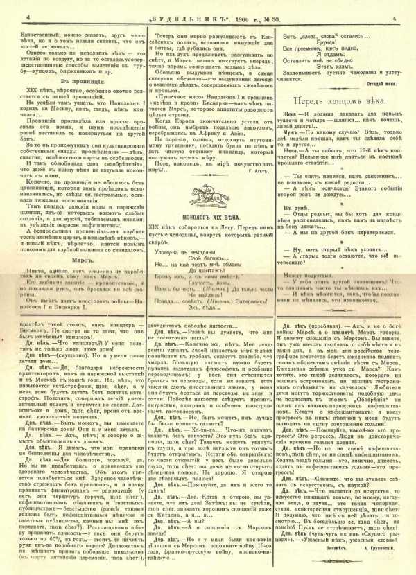 Понедельник, 16-е. Сего дня на А.Б.В.ж.дороге кондуктора и стрелочники почему-то будут трезвы. Курские соловьи летят в Курск из-за границы. В некоторых местах Донской области начинаются посевы. Астроном Бредихин в математическом обществе сделает сообщение о двух евреях, виденных им на планете Сатурн, которые, по его мнению, бежали на эту планету от воинской повинности. В Тамбове извержение вулкана. Столкновение кометы с г. Лентовским. В сей день Архимед перевернул бы землю, если бы ему дали точку опоры».