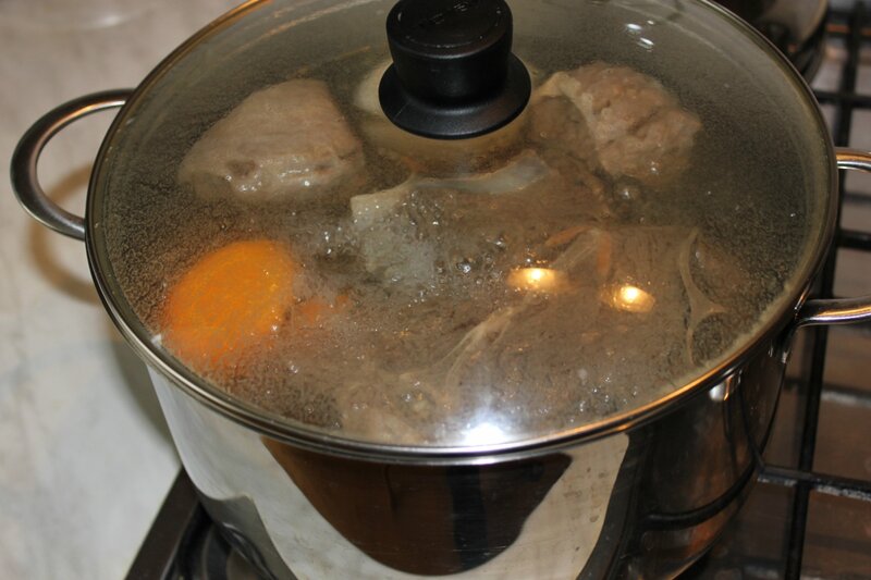 Когда мясо сварится (часа через полтора на медленном огне под крышкой) мы его достанем вместе с овощами. Эти овощи нам больше не пригодятся. БУЛЬОН НЕ СОЛИМ!