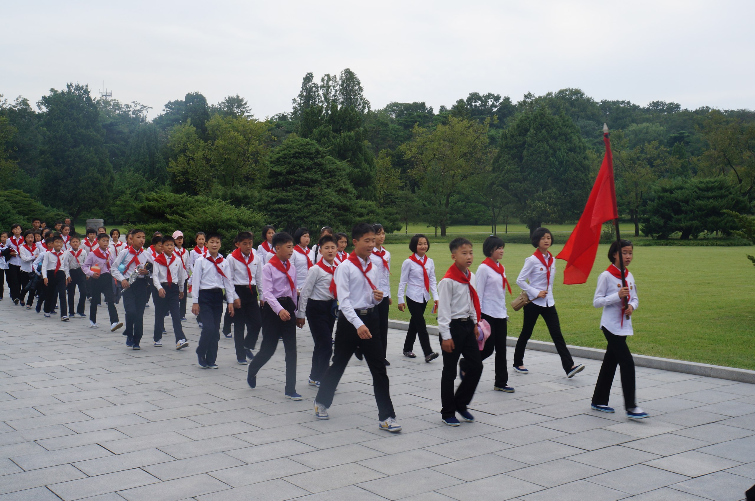 Делегация комсомольцев во главе с экскурсоводом в национальном костюме идет посещать Мангендэ - место, где родился и вырос Ким Ир Сен.