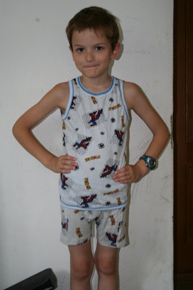 И последнее, что я успела освоить - трикотаж, для чего выпросила у свекрови коверлок :)Итак, две майки и двое боксеров для Сени (общая стоимость 160 рублей - 1 метр кулирки, отделка полосками из рибаны)