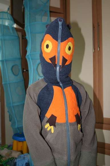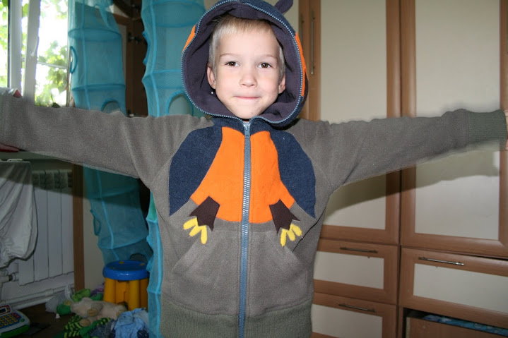 А этой зимой Афанасик увидел "куртку с совой", и мне пришлось научиться делать аппликацию на ткани (оказалось, что это не так уж и сложно, главное раздобыть два вида флизелина - клеевой с двух сторон и отрывной).Кстати, куртка из настоящего полара, теплого и легкого, низы - отделка рибаной, аппликация - остатки флиса и вискозного трикотажа. Общая стоимость - около 300 рублей.