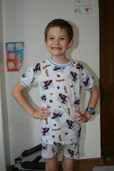И последнее - моя гордость :) Костюмчик для Мишика из интерлока. Двое штанишек и толстовка, общей стоимостью около 100 рублей. Шила два вечера: сначала две пары штанишек, потом толстовку. Все кроила и шила со спящим Мишей в слинге.