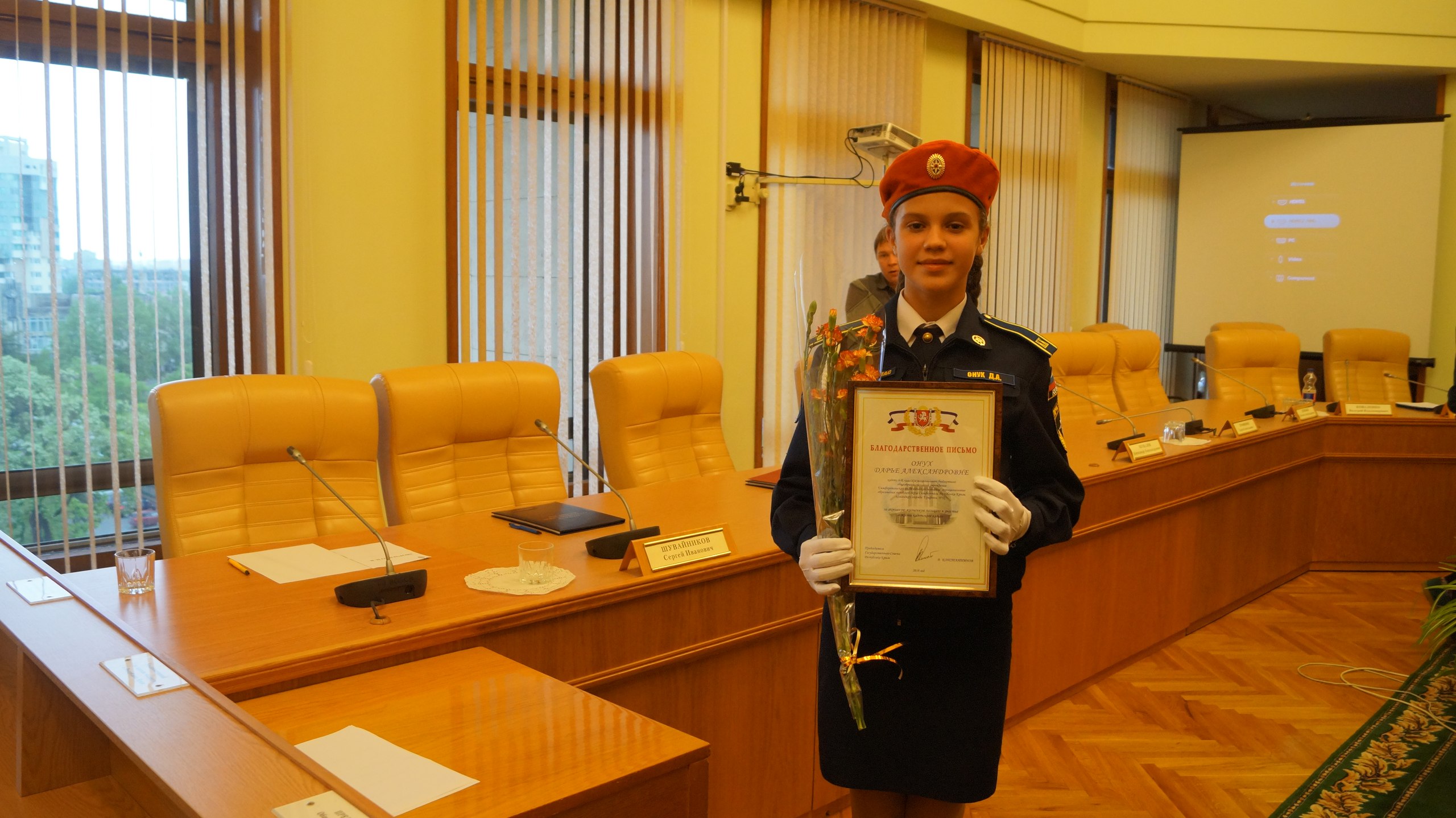 Затем Владимир Константинов вручил награды тем, кто проводит активную работу по героико-патриотическому воспитанию подрастающего поколения крымчан и лучшим пяти кадетам школ города Симферополя, в число которых вошла и командир 6к класса Онух Дарья.