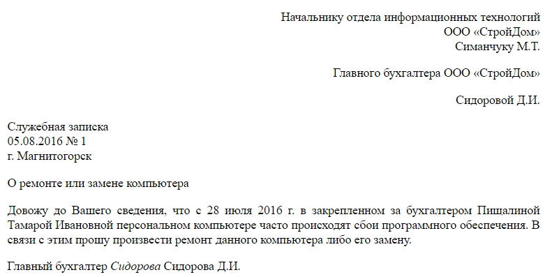 - Если записка составляется по причине поломки оборудования, важно указать, из-за чего это произошло.