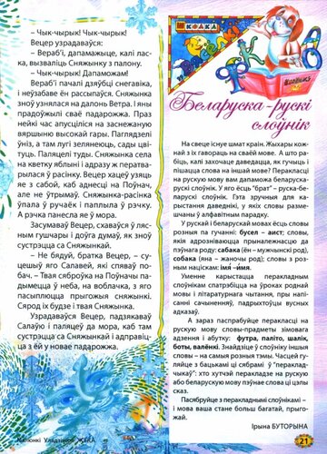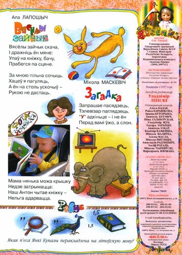 Краткая информация о журнале: способствовать развитию детей, прививать им любовь к Родине и родному белорусскому языку, приобщать к творчеству (в редакцию читатели присылают собственные стихи и сказки, а еще рисунки)