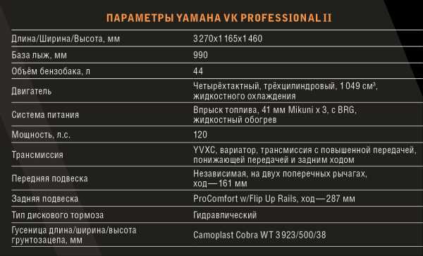 В конце добавим несколько слов о впечатлении, которое произвёл на нас тестовый Yamaha VK Professional II. Не секрет, что техника этой марки отличается уникальной надёжностью и четырёхтактные японские снегоходы стали новыми легендами Русского Севера. То есть если выбросить из головы хрестоматийный образ рыбака или охотника на чадящих и ревущих двухтактниках, то именно VK Professional II является сегодня максимально универсальным снегоходом для работы и отдыха. Несмотря на внушительный вес он весьма динамичен, а благодаря новой гусенице его проходимость вызывает уважение. Кроме того, после доработки эргономики водительского и пассажирского мест длительные путешествия на VK Professional II перестали быть существенной проблемой. В 2015 году эта машина сменила заслуженного ветерана «снежного» рынка — модель RS Viking Professional. Что изменилось? В первую очередь, нужно отметить усовершенствованную силовую установку. Конечно, по сути это старый добрый трёхцилиндровый четырёхтактный Genesis c новой системой впрыска топлива EFI и мощностью 120 л.с., но японские инженеры существенно доработали двигатель и прибавка в его объёме позволила улучшить мощностную и моментную отдачу во всём диапазоне оборотов. Заодно для более эффективного охлаждения был установлен новый радиатор оптимизированной конструкции.