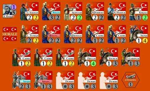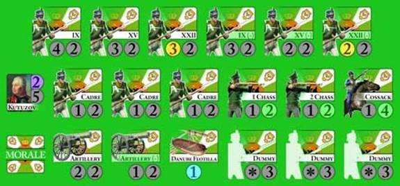 После такого успеха дело осталось за малым – масштабирование частей в рамках игровой системы. Заметим, что стандартной практикой для серии игр Наполеоник’20 является корпусной уровень организации фишек. Но в таком случае, учитывая небольшую численность сторон, в игре могло находиться всего 3-4 фишки, что сделало бы ее не интересной. С другой стороны, с выходом игр, посвященных сражениям в Испании, в серии стал появляться новый стандарт — дивизионный (это, разумеется, повлияло и на уменьшение величины гекса с 1 мили до половины мили). В данной игре также выдержан дивизионный масштаб, при котором 1 единица боевой мощи эквивалентна 2000 русских или 3000 турецких солдат. Кроме того, в связи с тем, что последние версии правил позволяют более гибко отображать качество боевой подготовки войск, большая часть турецких частей несут те или иные штрафы, что в целом позволило лучше показать низкую боеспособность большей части турецкой армии.