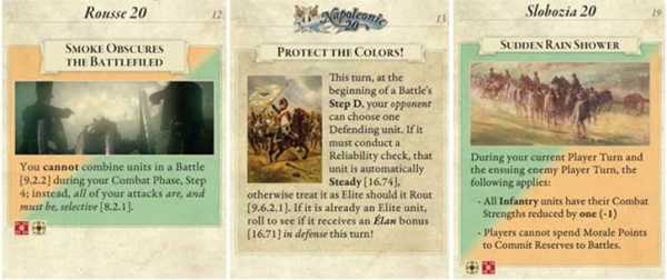 О тактических картах. Первоначально задумывался один большой сценарий, затрагивающий сразу две битвы (от результатов первого боя зависело, состоится ли вообще второй), и поэтому задумывалась одна колода тактических карт. Но в ходе тестов мы поняли, что потенциал получающейся игры таков, что мы вполне можем сделать два интереснейших сценария в рамках одной игры, и получатся фактически 2 игры в одной коробке! Таким образом, набор тактических карт пришлось расширить на каждый сценарий, и теперь у нас для каждого сценария свой набор карт – для Rousse 20 и для Slobozia 20. Состав карт вполне традиционен для линейки игр Napoleonic 20, и вместе с тем мы постарались отобразить некоторые особенности тех сражений. Кстати, хоть и виртуально, но французы присутствуют в игре – в одной из игровых карточек.