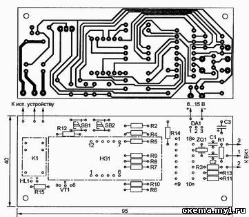 Устройство изготовлено на печатной плате, возможный вариант которой показан на рисунке 2.