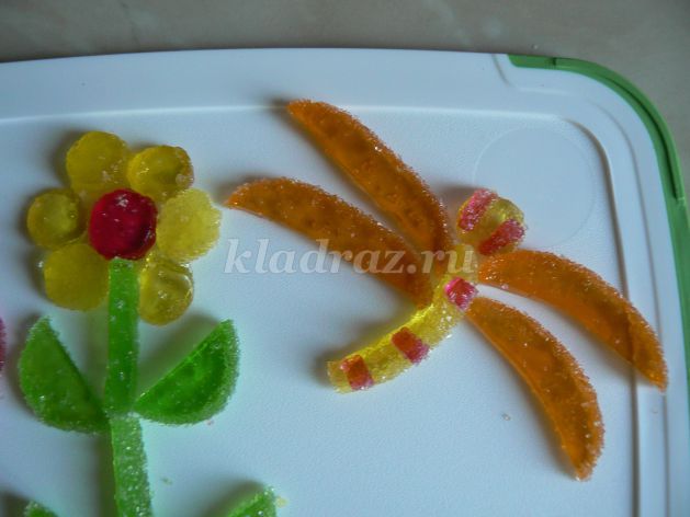 Далее — мармелад: если тоненько нарезать мармеладный рулетик, то получается очень красивое украшение в виде спирали. Из обычных цветных мармеладок и пастилы можно вырезать геометрические фигуры (тела) — кубики, пирамиды и т.д. Из «лимонных» и «апельсиновых» долек вырезаете осенние листочки или лепестки цветов — дольки плоские, поэтому справиться с задачей будет не сложно.