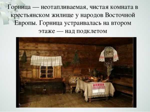 Горница — неотапливаемая, чистая комната в крестьянском жилище у народов Восточной Европы. Горница устраивалась на втором этаже — над подклетом