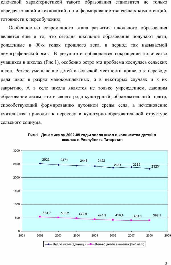 3 ключевой характеристикой такого образования становится не только передача знаний и технологий, но и формирование творческих компетенций, готовности к переобучению. Особенностью современного этапа развития школьного образования является еще и то, что сегодня школьное образование получают дети, рожденные в 90-х годах прошлого века, в период так называемой демографической ямы. В результате наблюдается сокращение количество учащихся в школах (Рис.1), особенно остро эта проблема коснулась сельских школ. Резкое уменьшение детей в сельской местности привело к переводу ряда школ в разряд малокомплектных, а в некоторых случаях и к их закрытию. А в селе школа является не только учреждением, дающим образование детям, это и своего рода культурный, образовательный центр, способствующий формированию духовной среды села, а исчезновение учительства приводит к перекосу в культурно-образовательной структуре сельского социума. Рис.1 Динамика за годы числа школ и количества детей в школах в Республике Татарстан ,7 505,2 472,9 441,9 416,4 401,1 392, Число школ (единиц.) Кол-во детей в школах (тыс.чел.) 3