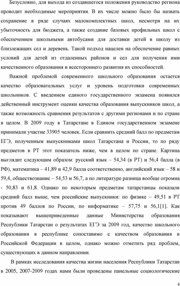 4 Безусловно, для выхода из создавшегося положения руководство региона проводит необходимые мероприятия. В их числе можно было бы назвать сохранение в ряде случаях малокомплектных школ, несмотря на их убыточность для бюджета, а также создание базовых профильных школ с обеспечением школьными автобусами для доставки детей в школу из близлежащих сел и деревень. Такой подход нацелен на обеспечение равных условий для детей из отдаленных районов и сел для получения ими качественного образования и всестороннего развития их способностей. Важной проблемой современного школьного образования остается качество образовательных услуг и уровень подготовки современных школьников. С введением единого государственного экзамена появился действенный инструмент оценки качества образования выпускников школ, а также возможность сравнения результатов с другими регионами и по стране в целом. В 2009 году в Татарстане в Едином государственном экзамене принимали участие человек. Если сравнить средний балл по предметам ЕГЭ, полученным выпускниками школ Татарстана и России, то по ряду предметов в РТ этот показатель ниже, чем в целом по стране. Картина выглядит следующим образом: русский язык 54,34 (в РТ) и 56,4 балла (в РФ), математика 41,89 и 42,9 балла соответственно, английский язык 58 и 59,4, обществознание 54,53 и 56,7, а по литературе разница вообще огромна - 50,83 и 61,8. Однако по некоторым предметам татарстанцы показали средний балл выше, чем российские выпускники: по физике 49,51 в РТ против 49 баллов по России, по информатике 57,75 и 56,1[1]. Как показывают вышеприведенные данные Министерства образования Республики Татарстан о результатах ЕГЭ за 2009 год, качество школьного образования в республике сопоставимо с качеством образования в Российской Федерации в целом, однако можно отметить ряд проблем, существующих в данном направлении. В рамках исследования качества жизни населения Республики Татарстан в 2005, годах нами были проведены панельные социологические 4