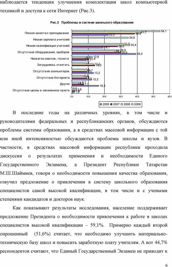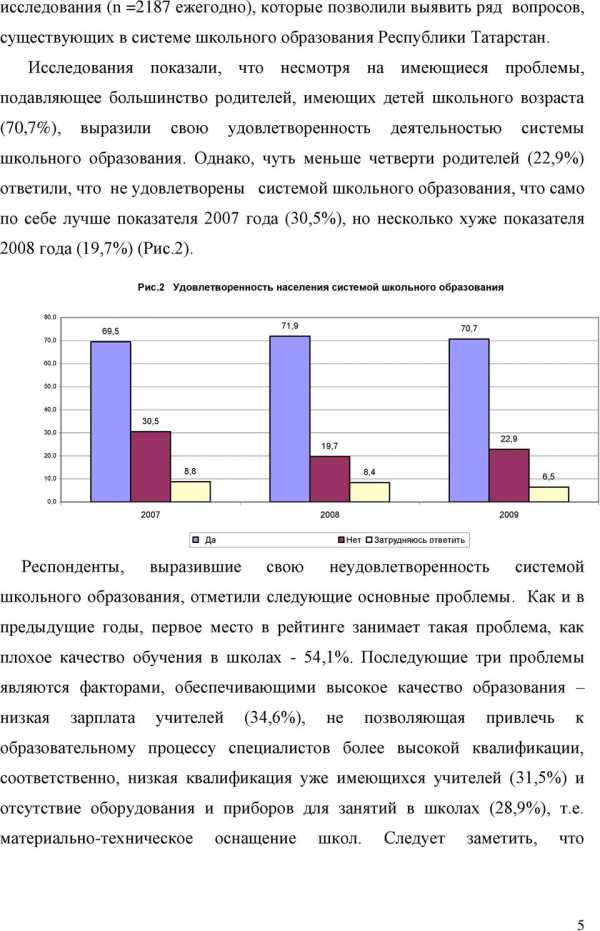 5 исследования (n =2187 ежегодно), которые позволили выявить ряд вопросов, существующих в системе школьного образования Республики Татарстан. Исследования показали, что несмотря на имеющиеся проблемы, подавляющее большинство родителей, имеющих детей школьного возраста (70,7%), выразили свою удовлетворенность деятельностью системы школьного образования. Однако, чуть меньше четверти родителей (22,9%) ответили, что не удовлетворены системой школьного образования, что само по себе лучше показателя 2007 года (30,5%), но несколько хуже показателя 2008 года (19,7%) (Рис.2). Рис.2 Удовлетворенность населения системой школьного образования 80,0 70,0 69,5 71,9 70,7 60,0 50,0 40,0 30,0 20,0 30,5 19,7 22,9 10,0 8,8 8,4 6,5 0, Да Нет Затрудняюсь ответить Респонденты, выразившие свою неудовлетворенность системой школьного образования, отметили следующие основные проблемы. Как и в предыдущие годы, первое место в рейтинге занимает такая проблема, как плохое качество обучения в школах - 54,1%. Последующие три проблемы являются факторами, обеспечивающими высокое качество образования низкая зарплата учителей (34,6%), не позволяющая привлечь к образовательному процессу специалистов более высокой квалификации, соответственно, низкая квалификация уже имеющихся учителей (31,5%) и отсутствие оборудования и приборов для занятий в школах (28,9%), т.е. материально-техническое оснащение школ. Следует заметить, что 5