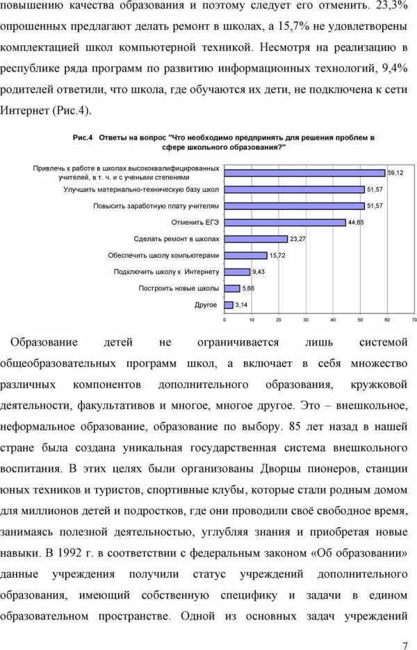 7 повышению качества образования и поэтому следует его отменить. 23,3% опрошенных предлагают делать ремонт в школах, а 15,7% не удовлетворены комплектацией школ компьютерной техникой. Несмотря на реализацию в республике ряда программ по развитию информационных технологий, 9,4% родителей ответили, что школа, где обучаются их дети, не подключена к сети Интернет (Рис.4). Рис.4 Ответы на вопрос "Что необходимо предпринять для решения проблем в сфере школьного образования?" Привлечь к работе в школах высококвалифицированных учителей, в т. ч. и с учеными степенями Улучшить материально-техническую базу школ Повысить заработную плату учителям 51,57 51,57 59,12 Отменить ЕГЭ 44,65 Сделать ремонт в школах 23,27 Обеспечить школу компьютерами 15,72 Подключить школу к Интернету Построить новые школы Другое 3,14 5,66 9, Образование детей не ограничивается лишь системой общеобразовательных программ школ, а включает в себя множество различных компонентов дополнительного образования, кружковой деятельности, факультативов и многое, многое другое. Это внешкольное, неформальное образование, образование по выбору. 85 лет назад в нашей стране была создана уникальная государственная система внешкольного воспитания. В этих целях были организованы Дворцы пионеров, станции юных техников и туристов, спортивные клубы, которые стали родным домом для миллионов детей и подростков, где они проводили своѐ свободное время, занимаясь полезной деятельностью, углубляя знания и приобретая новые навыки. В 1992 г. в соответствии с федеральным законом «Об образовании» данные учреждения получили статус учреждений дополнительного образования, имеющий собственную специфику и задачи в едином образовательном пространстве. Одной из основных задач учреждений 7