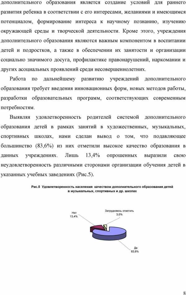 8 дополнительного образования является создание условий для раннего развития ребенка в соответствии с его интересами, желаниями и имеющимся потенциалом, формирование интереса к научному познанию, изучению окружающей среды и творческой деятельности. Кроме этого, учреждения дополнительного образования являются важным компонентом в воспитании детей и подростков, а также в обеспечении их занятости и организации социально значимого досуга, профилактике правонарушений, наркомании и других асоциальных проявлений среди несовершеннолетних. Работа по дальнейшему развитию учреждений дополнительного образования требует введения инновационных форм, новых методов работы, разработки образовательных программ, соответствующих современным потребностям. Выявляя удовлетворенность родителей системой дополнительного образования детей в рамках занятий в художественных, музыкальных, спортивных школах, нами сделан вывод о том, что подавляющее большинство (83,6%) из них отметили высокое качество образования в данных учреждениях. Лишь 13,4% опрошенных выразили свою неудовлетворенность различными сторонами организации обучения детей в указанных учебных заведениях (Рис.5). Рис.5 Удовлетворенность населения качеством дополнительного образования детей в музыкальных, спортивных и др. школах Нет 13,4% Затрудняюсь ответить 3,0% Да 83,6% 8