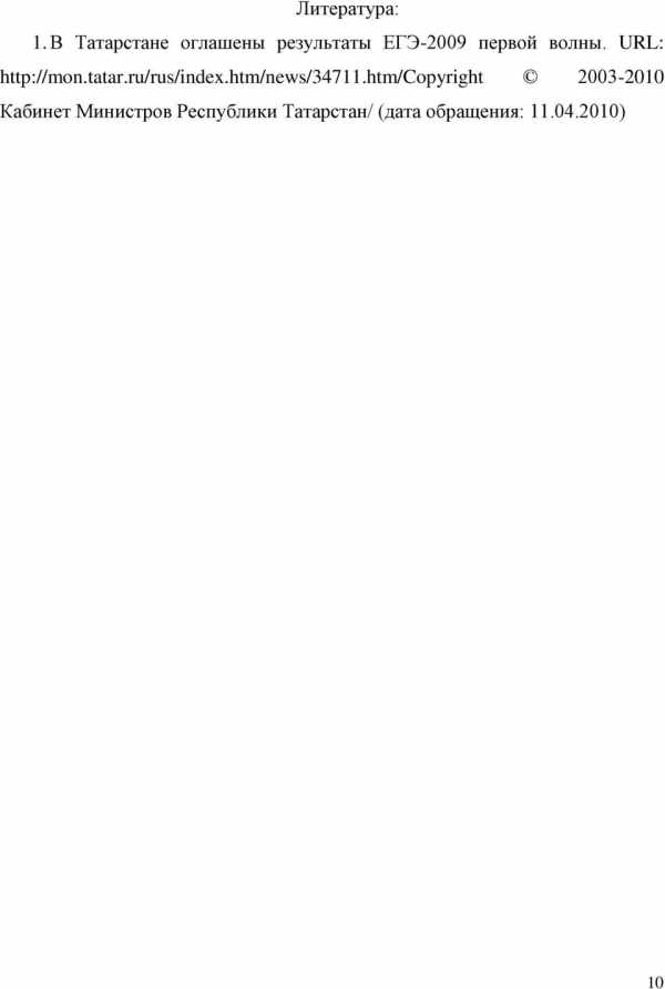 10 Литература: 1. В Татарстане оглашены результаты ЕГЭ-2009 первой волны. URL: Кабинет Министров Республики Татарстан/ (дата обращения: ) 10