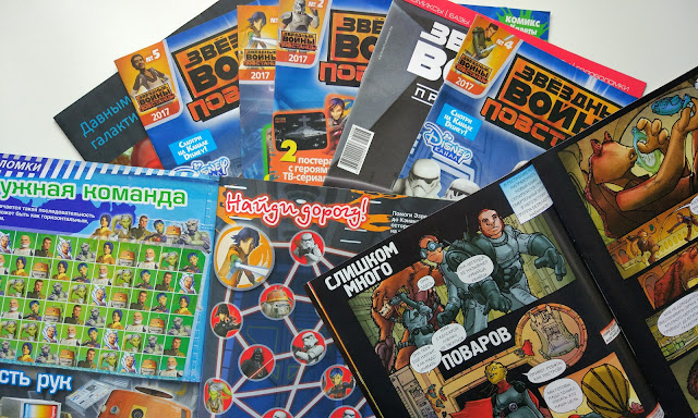 По Звездным войнам выпускается 2 журнала: Приключения и Повстанцы. И в том, и в другом есть комикс, плакат, головоломки, досье на персонажей.
