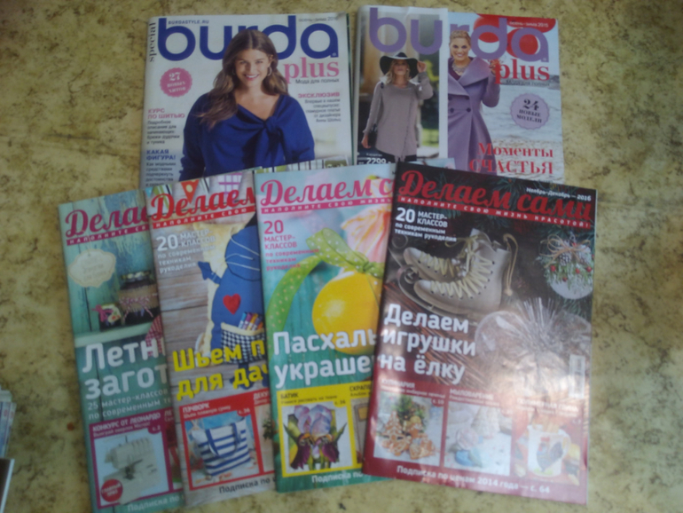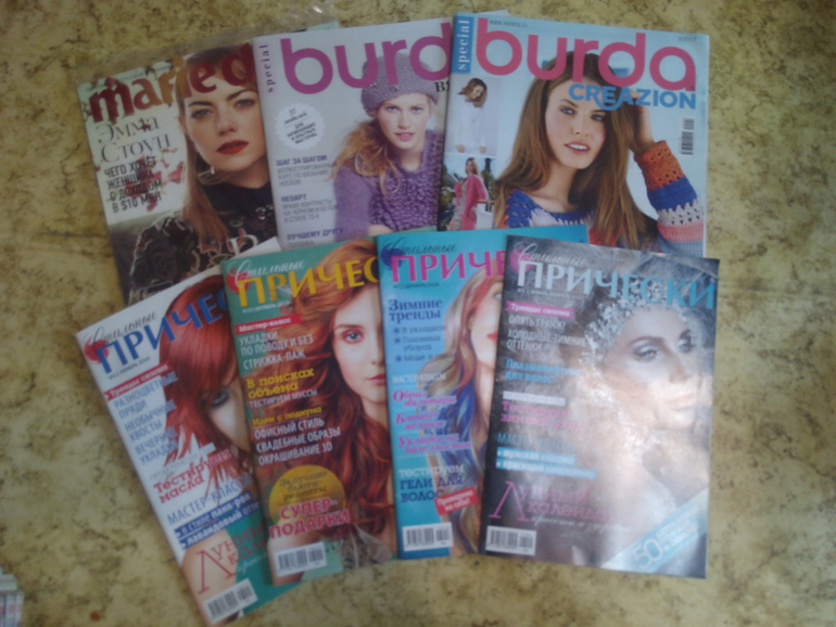 Прически, мари клер, бурда моден, а так же уйма изданий по вязанию, рукоделию, шитью!