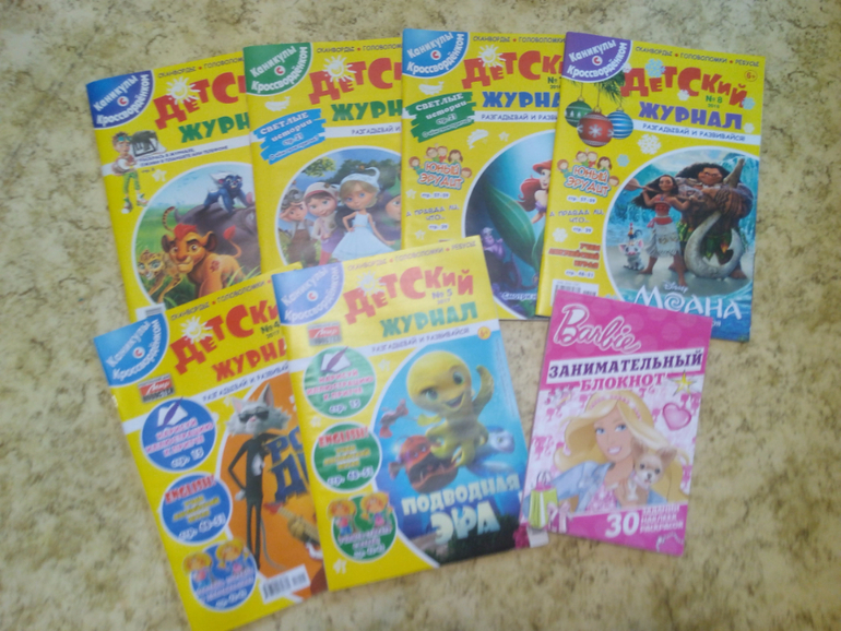 Великое множество детских журналов для мальчиков и девочек с их любимыми мультперсонажами! Внутри подарок-игрушка, блокнот, пенал, ручка и прочая мелочь. Но гораздо приятнее купить журнал с игрушкой за 40-50 руб, нежели за 150-250