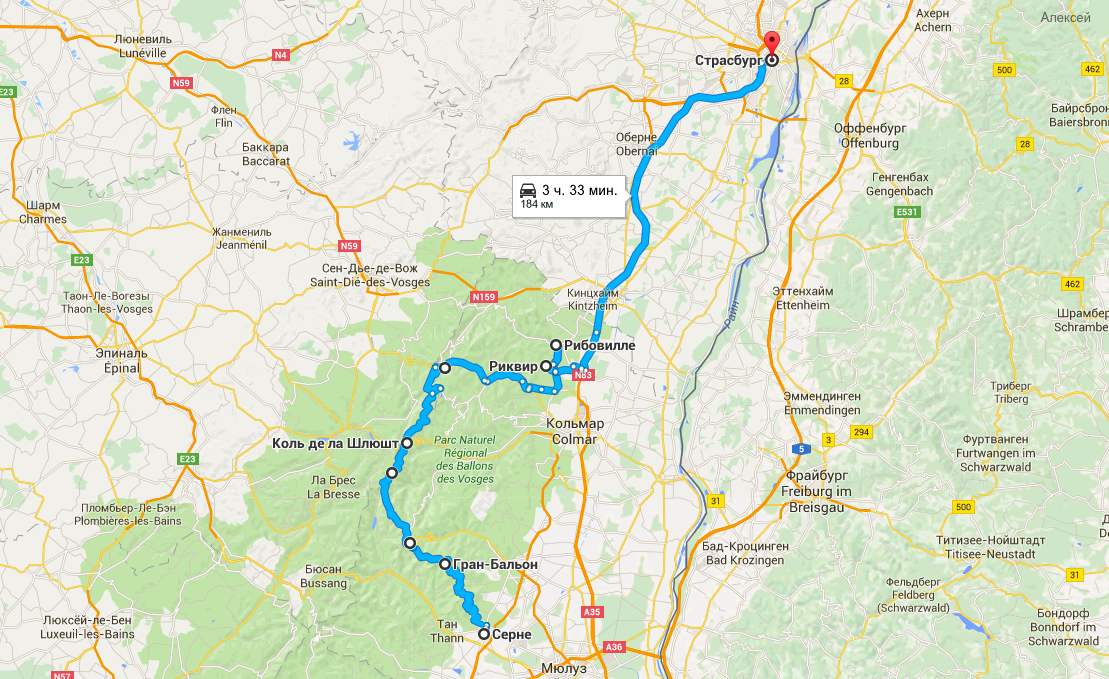 2.А вот карта извилистой Винной Дороги Эльзаса.