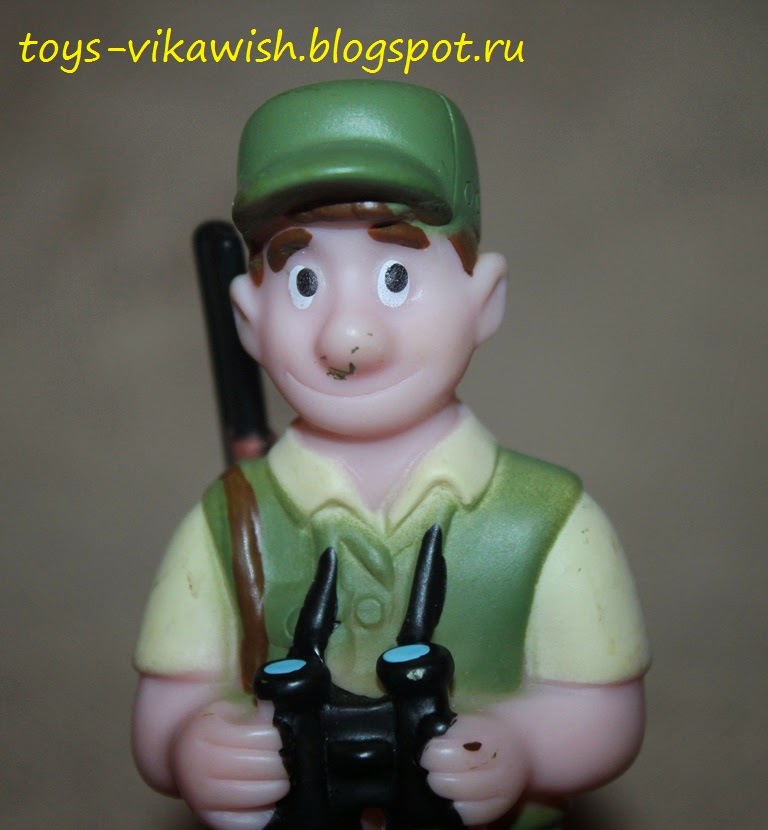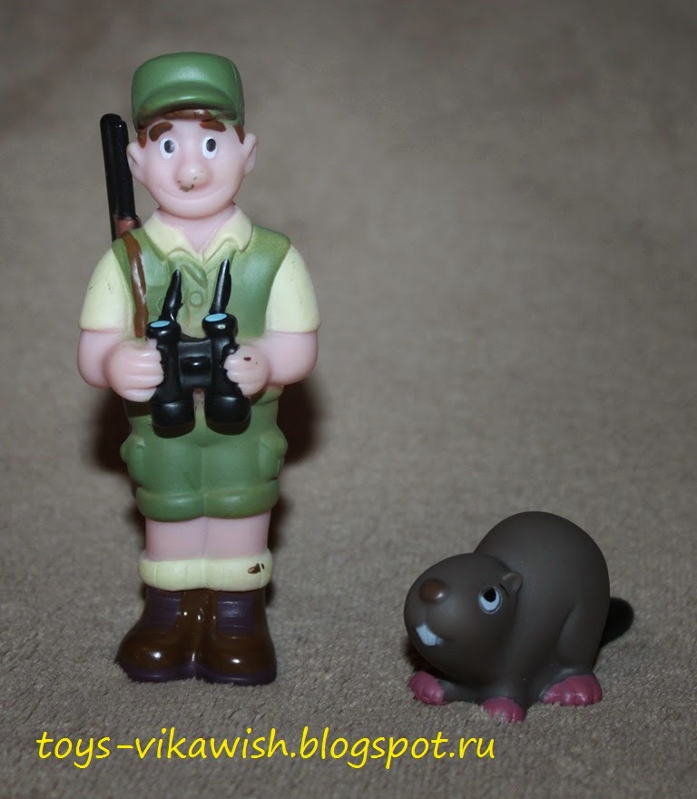 Этот номер мы тоже купили. Дочке захотелось охотника. Иван оказался очень плохого качества, весь (с головы до ног) изляпан краской. Даже нос! Раскрашен неаккуратно. Судя по отзывам из интернета, вся партия какая-то бракованная. У лесника на спине висит ружье, оно снимается, оставляю на спине Ивана дырки. А вот бобренок очень порадовал - такой милаха. И по качеству нам нормальный попался.