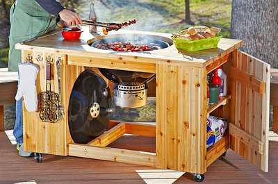 Вы можете сделать этот столик-тележку за пару выходных из обычных досок или вместо дощатой крышки изготовить по нашему методу и установить бетонную плиту, которой не страшны никакие атмосферные воздействия. В любом случае, в этом мобильном кулинарном центре есть место для разделки продуктов, отсеки для хранения принадлежностей и крючки для подвески кухонной утвари. Стоит вам только начать жарить мясо, и на его аромат соберется компания друзей.