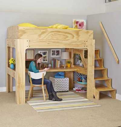 Несложная в изготовлении конструкция имеет полноразмерный матрас над рабочей зоной и две полки. Она экономит место, занимая на полу площадь размерами 1734х2578 мм. Такая кровать отлично впишется в детскую комнату, студенческое общежитие или малогабаритную квартиру, — везде, где требуется эффективно использовать пространство. Узлы конструкции соединяются с помощью крепежа, позволяющего легко разобрать её и переместить в другое место.