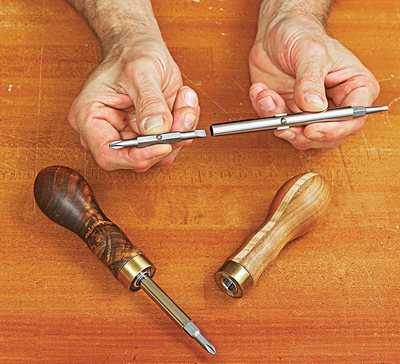 Выточить удобную ручку для отвёртки очень просто, и с этим проектом успешно справится даже начинающий токарь. Вы можете взять любой материал, начиная от древесного нароста с причудливо переплетающимися волокнами до обычных обрезков, в изобилии имеющихся в каждой мастерской. Чтобы ручка выглядела эффектно, мы склеили одну заготовку из клёна и вишни.