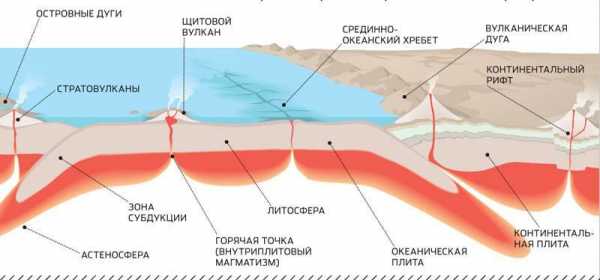 Вокруг Тихого океана протянулось «Тихоокеанское огненное кольцо» — цепочка из более чем 300 самых активных вулканов нашей планеты: Камчатка, Курильские, Японские, Филиппинские острова, Новая Гвинея, Соломоновы острова, Новая Зеландия, северо-восточная Антарктида, Огненная Земля, Анды, Кордильеры и Алеутские острова. «В Тихом океане существуют зоны спрединга, где рождается океанская литосфера- срединно-океанские хребты, — объясняет Николай Селиверстов.- А на периферии океана расположены зоны субдукции — здесь литосфера, в составе пород которой содержится большое количество воды, погружается под материковую плиту. Вода резко понижает температуру плавления пород, и в результате при достижении глубины 150−200 км, где температура достаточно высока, породы плавятся — образуется магматический очаг, питающий вулканы островных дуг, — это так называемый островодужный тип магматизма. К этому типу относятся камчатские и курильские вулканы. Другие типы магматизма — это магматизм срединно-океанских хребтов, а также внутриплитовый, связанный с подъемом плюмов (струй) очень горячей магмы с больших глубин, из нижней мантии, которые «прожигают' литосферу. К последнему типу относятся гавайские вулканы, а исландские представляют собой сочетание срединно-океанского и внутриплитового магматизма».