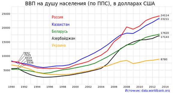 Динамика роста ВВП на душу населения по ППС России и других крупнейших государств, образованных в результате распада СССР, показано на рисунке 5 (Источник: Всемирный Банк) [3].