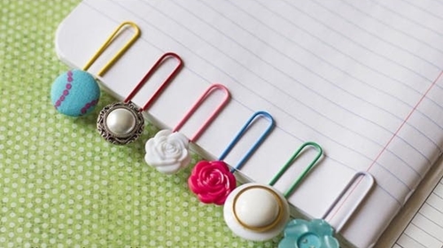 Наденьте пуговку на скрепку и закрепите ее горячим клеем в районе ножки. Буквально за полминуты у вас готова необычная и яркая книжная закладка.