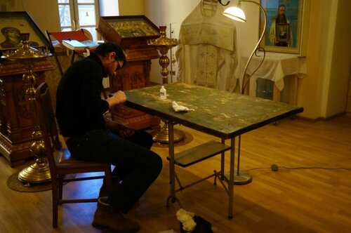 Алексей принес с собой все необходимое для пробной расчистки. Я его расположил в крестильне. «Икона сильно руинирована», - сказал он на профессиональном языке первичный диагноз после осмотра иконы. Потом я оставил его наедине с иконой, чтобы не мешать. Я занялся своими делами, но при этом внутренне с волнением ожидал разгадки вопроса, который волновал меня последний месяц. Часа через полтора Алексей оживленно выглянул из крестильни: «Батюшка, есть, что посмотреть...» То, что я увидел, стало как разгадкой, так и новой загадкой. На иконе было вскрыто изображение святого, которое находилось на самом краю доски, так что часть главы была утрачена. Было очевидно, что иконуеще и опилили, приспосабливая под столешницу. Но к счастью, лик святого в целом сохранился. Алексей пояснил, что в центре икона не только закрашена, но попросту стерта. Возможно, чтобы избавиться от взглядов святых красочный слой безжалостно счистили наждачной бумагой или абразивным кругом. Поэтому пробная расчистка не позволила выявить изображение в центре доски. Нужна более кропотливая расчистка всей иконы, чтобы составить о ней представление.