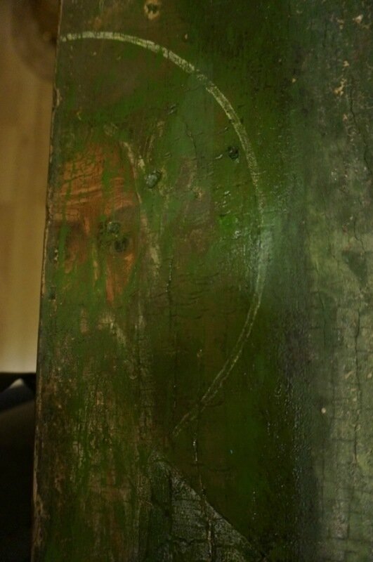 Вся икона оказалась закрашенной зеленой заборной краской. Судя по всему, лики на иконе не давали спокойно кушать за таким столом. Вообще страшно представить, как можно есть на иконе. Зримый образ торжества материального бытия над духовным. Такой пир на иконе сродни пиру во время чумы. Лики были густо закрашены, совесть успокоена. Обеды продолжены. В этой истории меня сразу заинтересовал вопрос, какой же святой изображен на этой многострадальной иконе? Какой же святой столько лет терпел такое отношение к себе?</cut> Но сколько мы на приходе в Заборье не рассматривали икону - и прямо, и сбоку, и с подсветкой — ничего рассмотреть было невозможно. Стало ясно, что икону нужно везти в Питер, показывать реставратором, делать пробные расчистки.