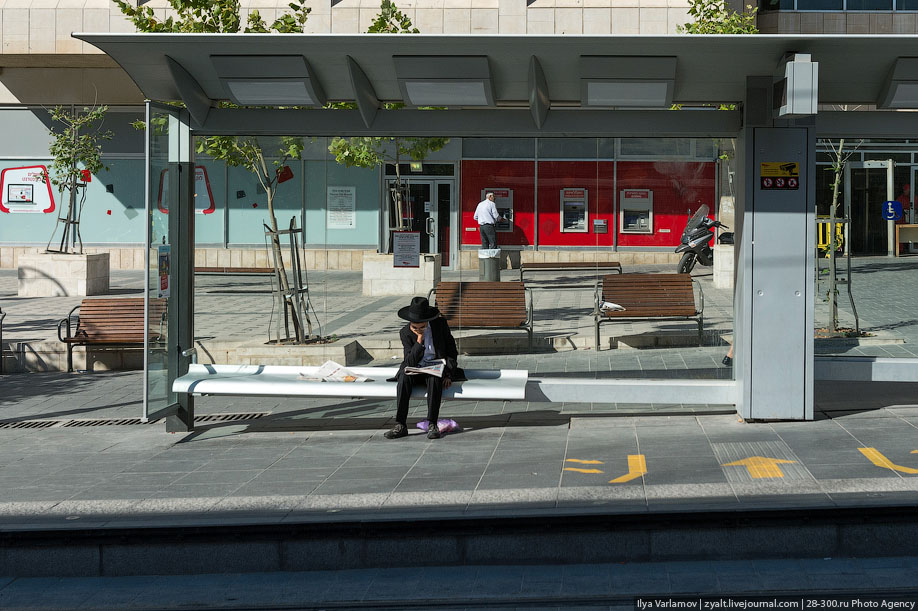 16. Остановки в трамвае объявляются на трёх языках мужскими голосами в следующей последовательности: иврит, арабский, английский