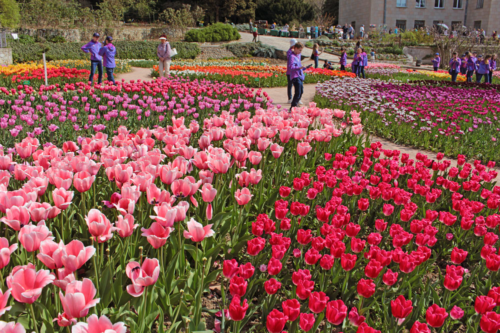 | Парад тюльпанов Никитского сада в этом году воистину золотой. Невероятное количество новых сортов, дружное цветение, идеальная ухоженность растений и выставочнойплощадки - все это дает мне право поставить его на первое место в рейтинге Парадов десятилетия. Но главное, что бросилось мне в глаза это очень интересное решениецветовых пятен экспозиции. В них собраны не контрастные, как обычно было, а родственные, близкие по звучанию оттенки. Сразу замечаешь красно-розовые, желто-золотые,пурпурно-сиреневые, красно-бордовые группы. Поэтому цветочный ковер не пестрит, а позволяет вам воспринимать малейшие нюансы и переходы цвета. По-моему, идеальноерешение и большая удача в оформлении выставки.