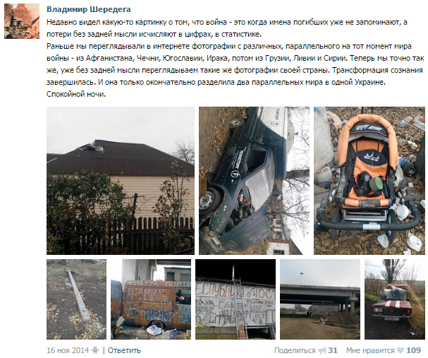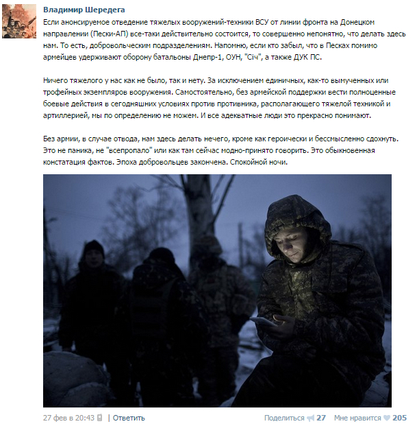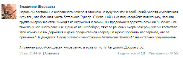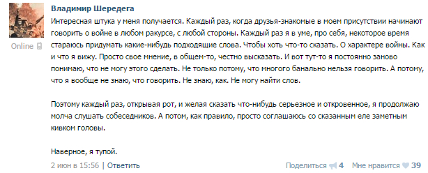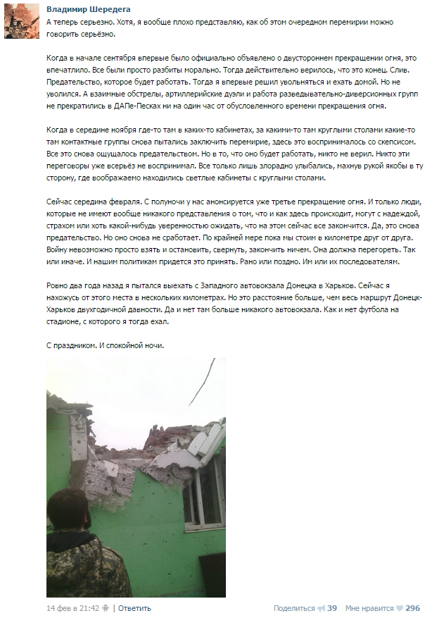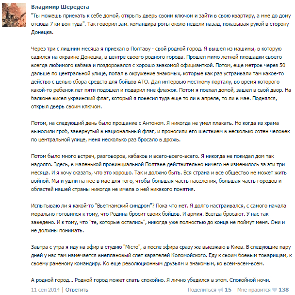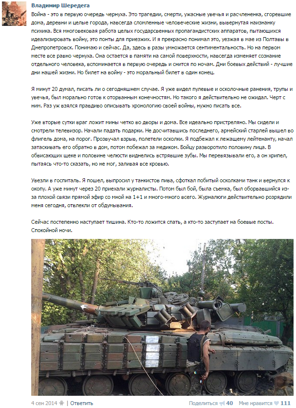 Давно обещался выложить продолжение записей в социальных сетях бойца украинского батальона (полка) "Днепр-1" В.Шередеги, да и вы нет-нет о них спрашивали. Охваченный период: август 2014 - июнь 2015.*****