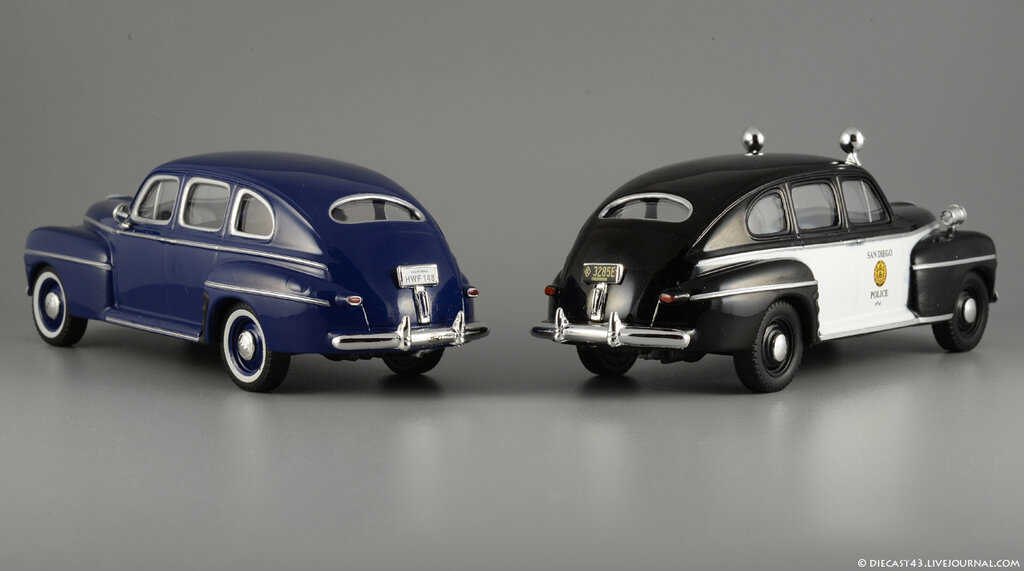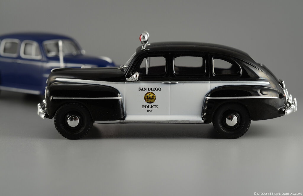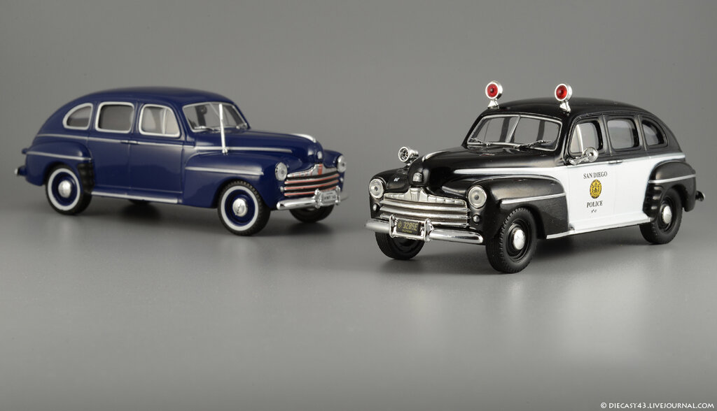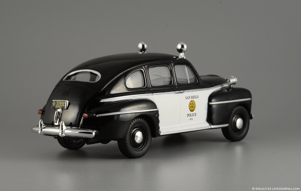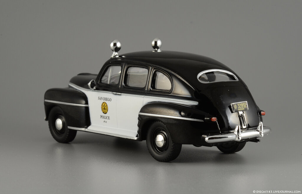 Китайские товарищи из PCT-IXO-IST уже давно объявили войну раритетам - в журнальных и регулярных сериях они перевыпустили многие свои ранние модели, ставшие предметом особого интереса собирателей: даже сложную и одну из лучших моделей IXO - Ford Model T не так давно запаковали в коробочки WhiteBox и продали всем желающим по разумной цене. Среди других довольно редких Фордов от IXO были, к примеру, Ford Taunus и Ford Super Deluxe Fordor Sedan 1947 года - оба уже по нескольку раз проданы собирателям журнальных серий в различных окрасках. И вот - очередная реинкарнация заслуженной и давно известной модели Форда 1947 года, на этот раз в серии "Полицейские машины мира" и в чёрно-белых цветах калифорнийской полиции из Сан-Диего.