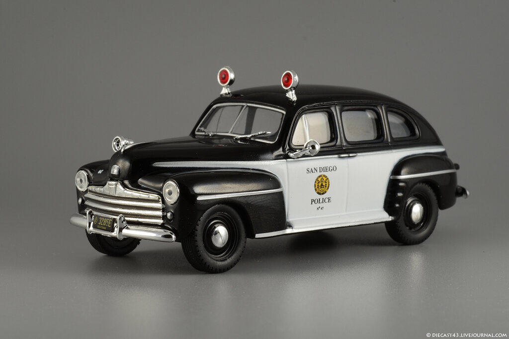 Модель автомобиля: 1947 Ford V8 Super Deluxe Fordor Sedan San Diego Police Наименование модели: Ford Fordor 1047Производитель: PCT (IST) по заказу ДеАгостиниДата выпуска: 20 января 2015 годаКаталожный номер: отсутствуетСерия: журнальная "Полицейские машины мира" №50Тираж: заявленный тираж 21 200 экз.Краткое мнение: бывший раритет на службеСубъективная оценка: 8/10